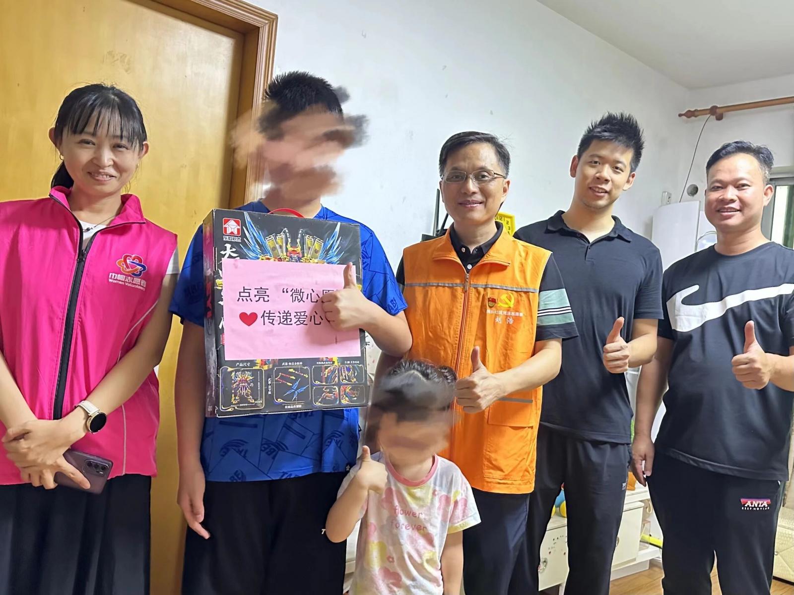 当天,由民乐社区党委班子、集团各党群工作部代表成员、党员志愿者、巾帼志愿者组成“爱心圆梦小分队”穿梭在民乐社区巷道楼栋间,带着准备好的“微心愿礼物”来到困境儿童家中。走访中,“爱心圆梦小分队”与困境儿童家庭亲切交谈,深入了解孩子们健康状况和生活情况,并为他们送上准备好的礼物。“哇!我想了好久的溜冰鞋,谢谢哥哥姐姐们!”“我马上就要开始寄宿上课了,刚好需要一个行李箱,也可以带着它去旅游啦!”当“爱心圆梦小分队”将微心愿礼物送到孩子们的手中时,他们满心喜悦,脸上都是灿烂的笑容。