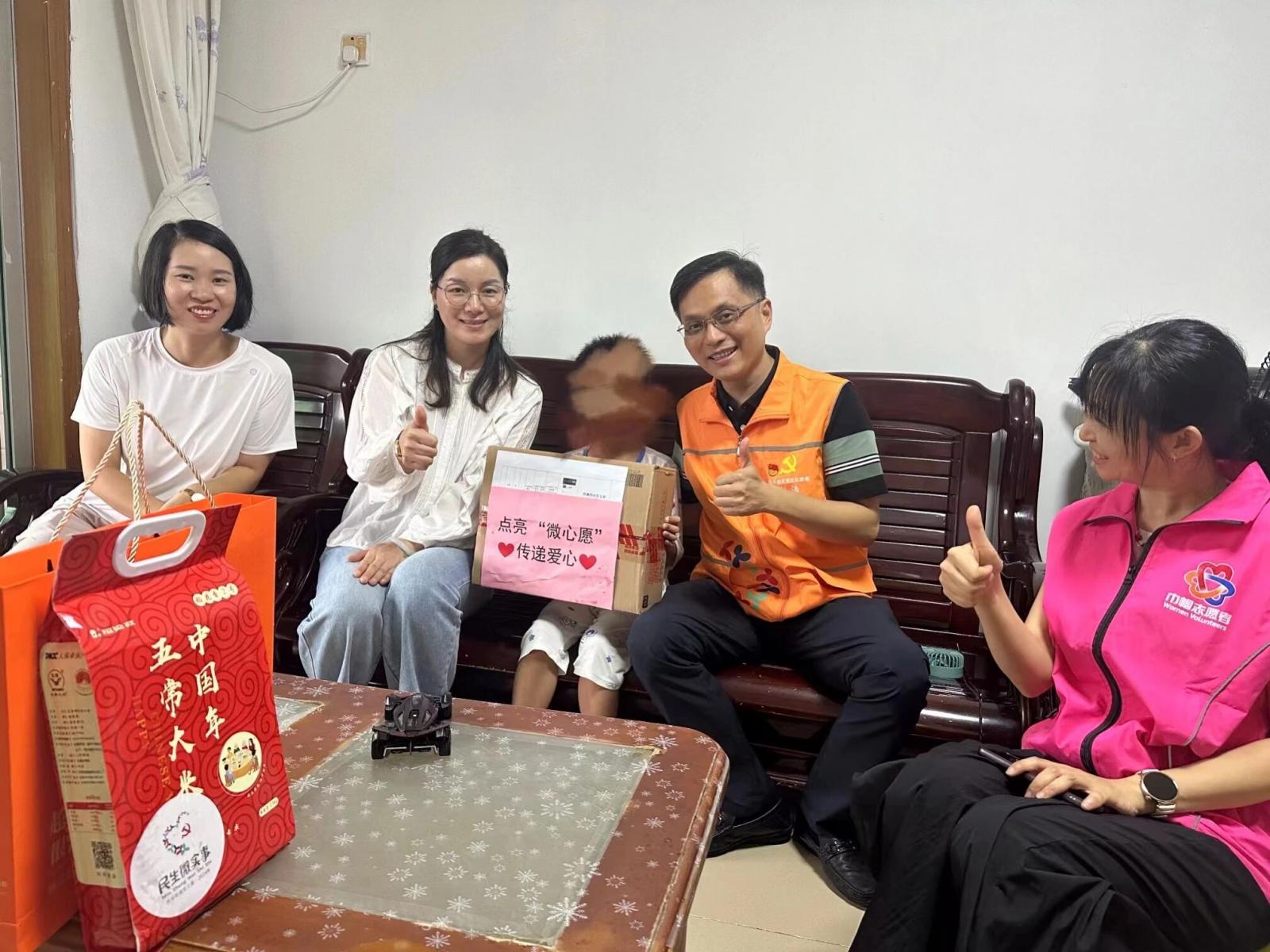 为全力配合结对社区民乐社区深入推进“百千万工程”,进一步关爱帮扶其辖区弱势群体,集团积极响应认领爱心“微心愿”,自愿采购儿童自行车、电话手表、乐高玩具、绘画套装、溜冰鞋、行李箱等,为困境儿童点亮希望、助燃欢乐。