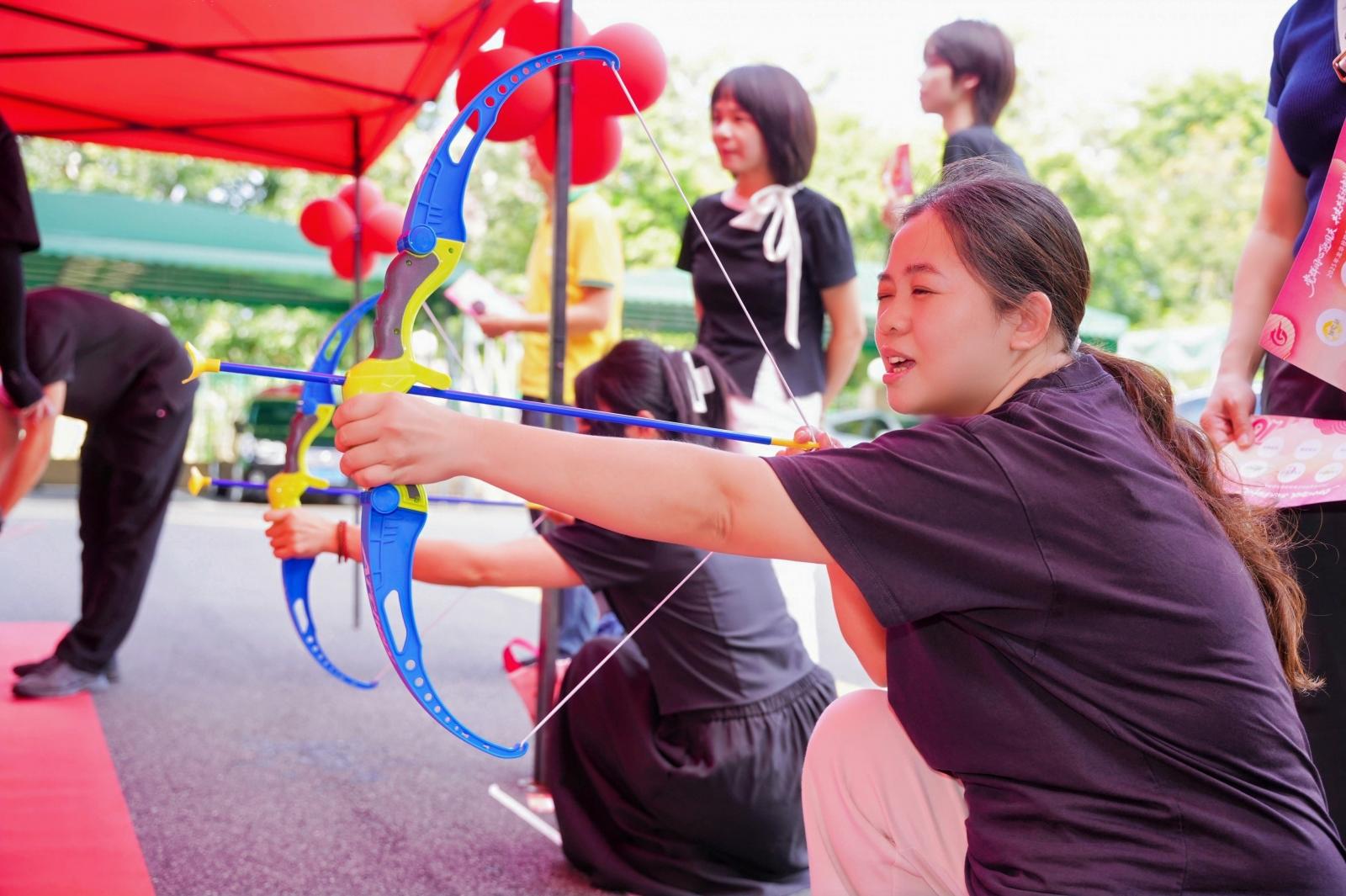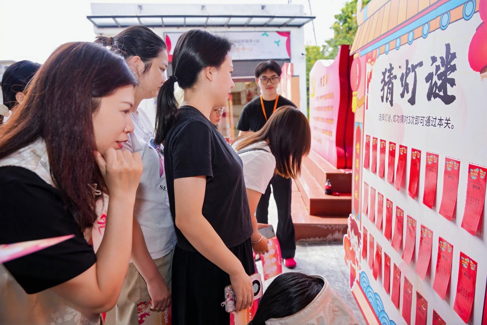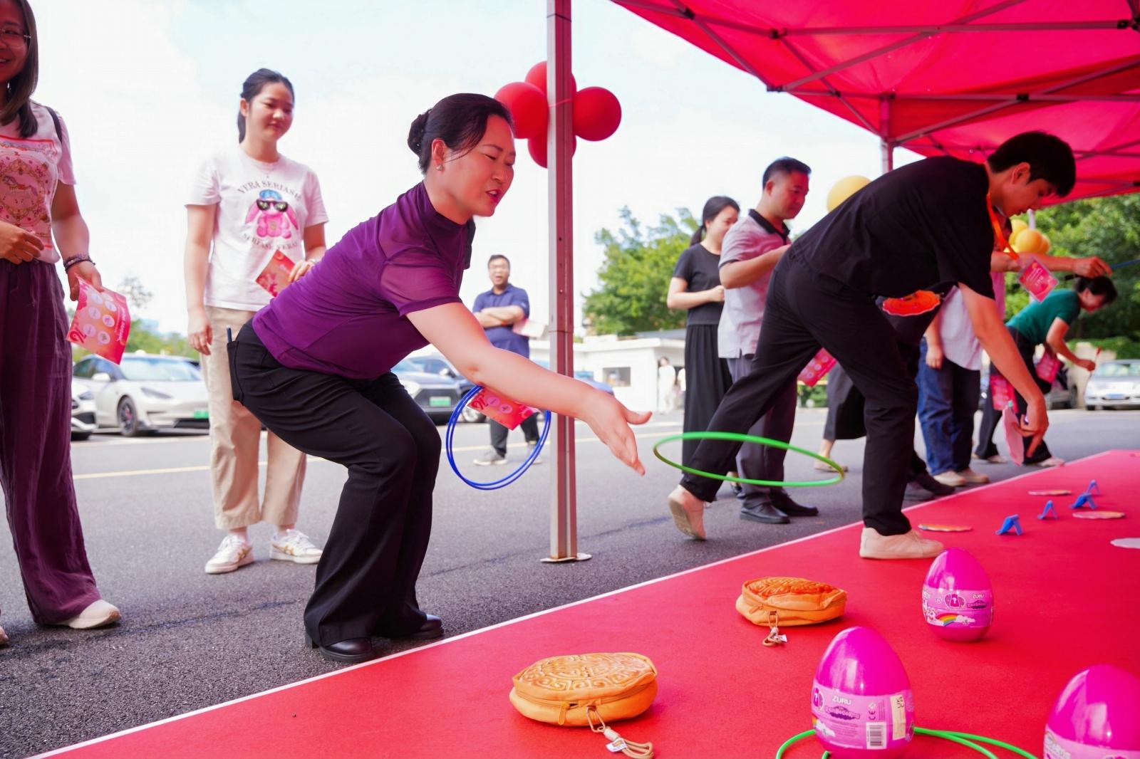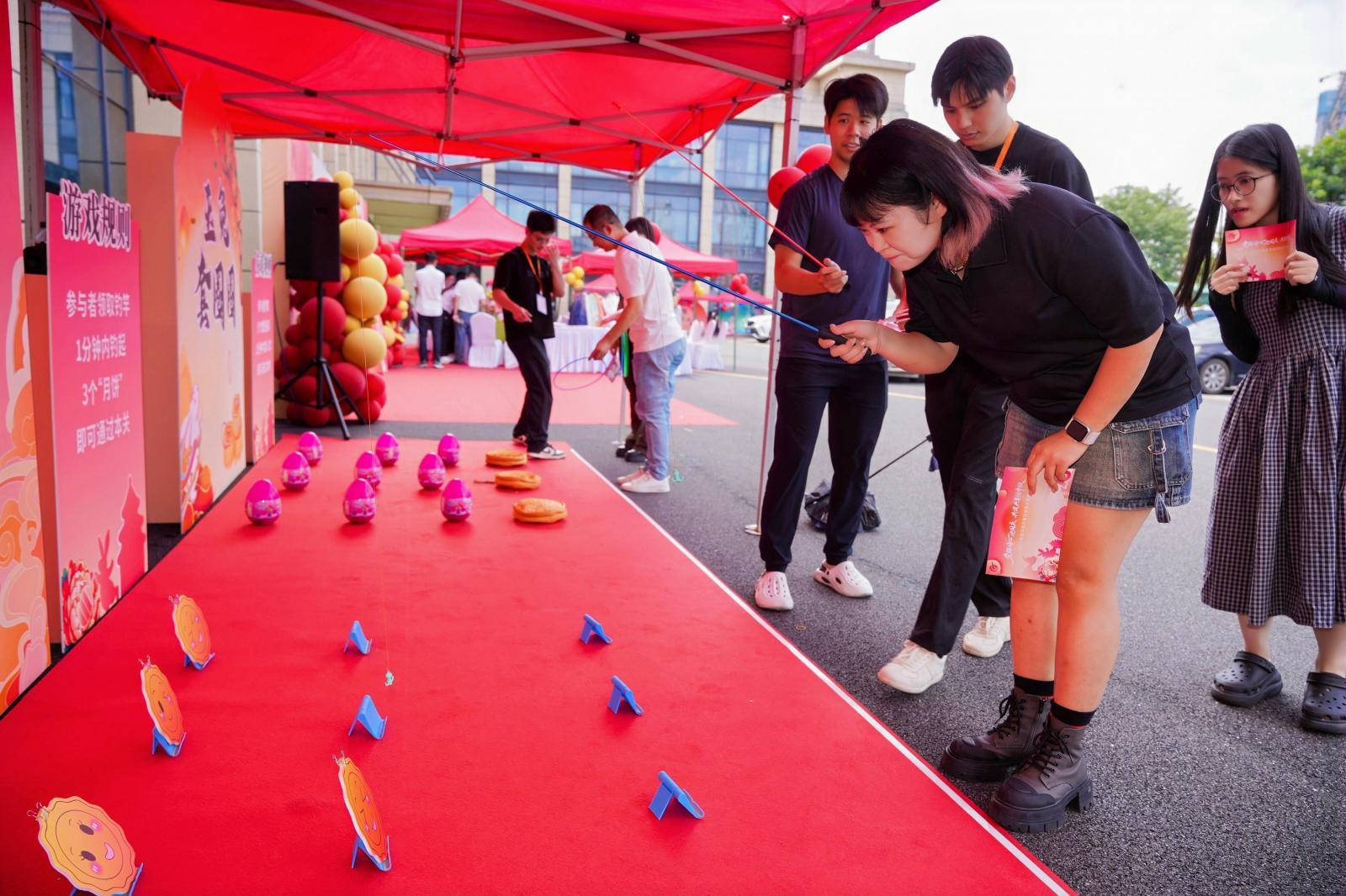 在趣味游戏区,党员干部职工尽情投入参与猜灯谜、玉兔套圈、玉兔钓月饼、玉兔投壶、后羿射日、夹月饼等互动游戏,通过完成游戏目标收集印章,参与幸运大转盘抽奖,获得种类丰富的精美礼品。同时,设置主题背景墙,供大家拍照打卡,合影留念。