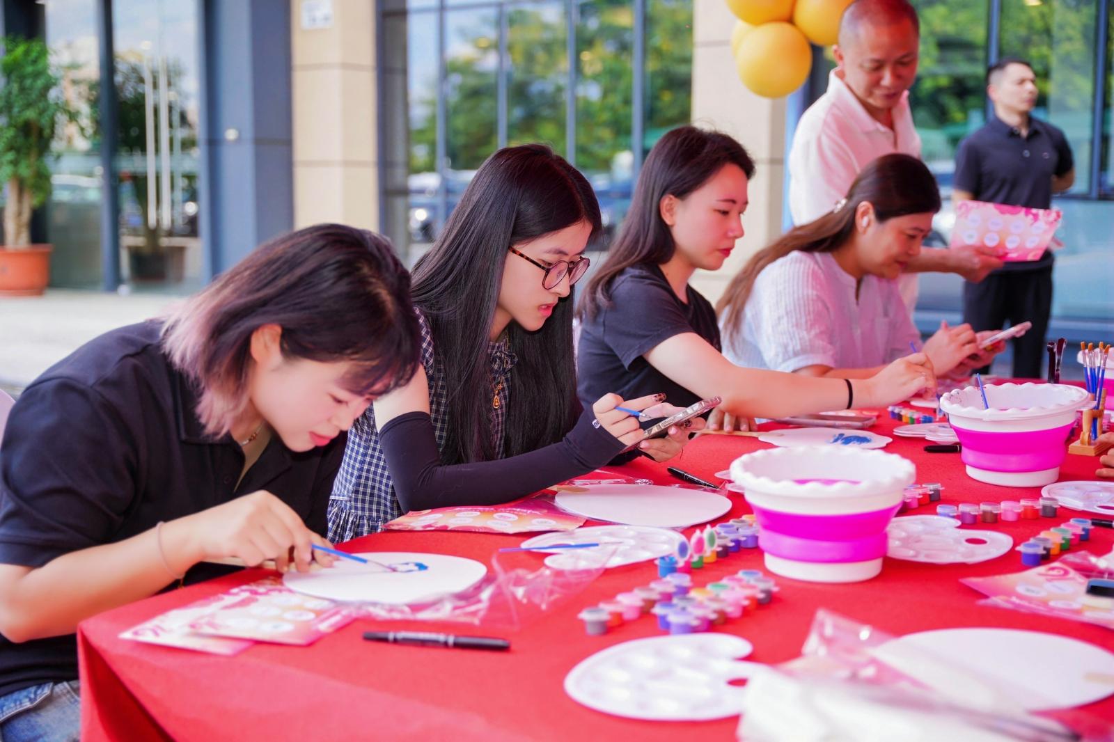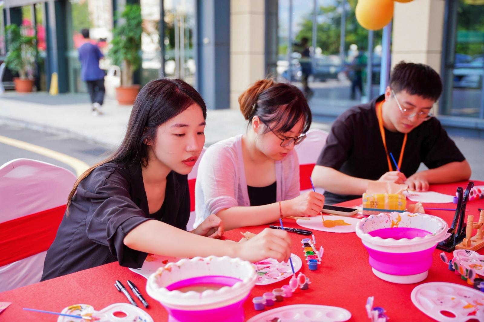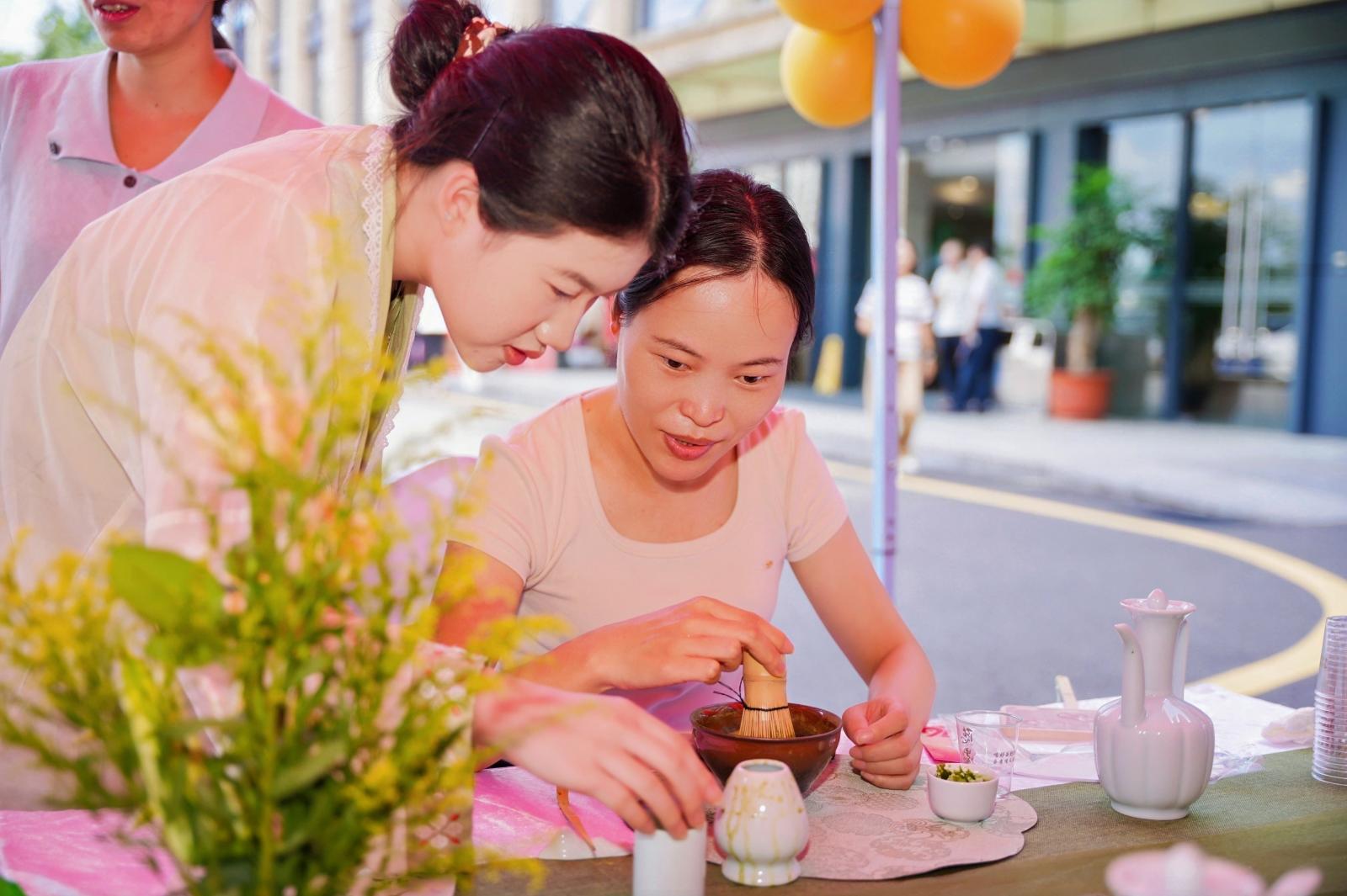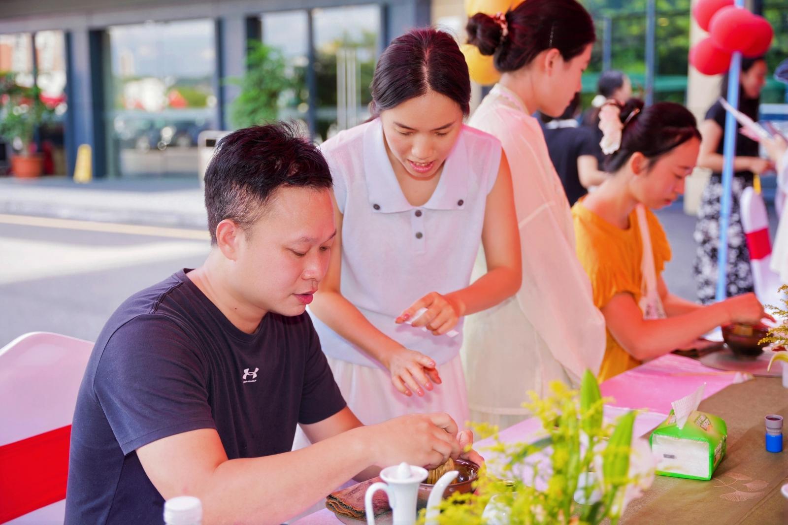 在文化体验区,点茶让参与者亲手体验注水、击拂的过程,在“静、雅、和”的仪式感中感受非遗文化的深厚底蕴;画扇体验中,职工们以“中秋月色”“国庆华章”为主题自由创作,或绘团圆佳景、或描创意卡通、或书“国泰民安”“强国有我”“不焦绿”“摇钱扇”等祝福语,将满满的节日期盼与企业事业发展愿景融入笔墨,一把把空白的纸扇变身为传递心意的“文化信物”。