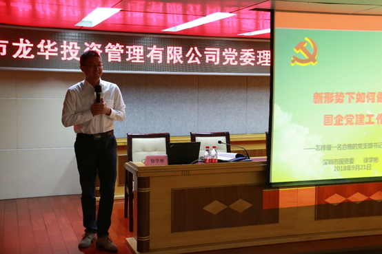 9月21日上午,龙华投控集团党委理论学习中心组学习(扩大)会在龙鹏大楼会议室召开。会议邀请市国资委党办副主任徐学彬同志围绕“如何做好新形势下国企党建工作”作专题辅导。区财政局(国资委)林卫华副局长,集团本部领导班子成员,各部门负责人,各辖属公司党政班子成员(含支部书记及委员、经营班子成员、董事、监事)约50人参加会议。