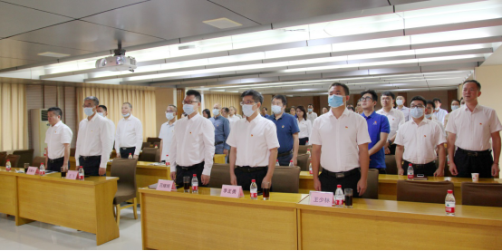 上午10时许,庆祝大会正式开始。全体党员领导干部与庆祝大会现场一致肃立,迎奏国歌。