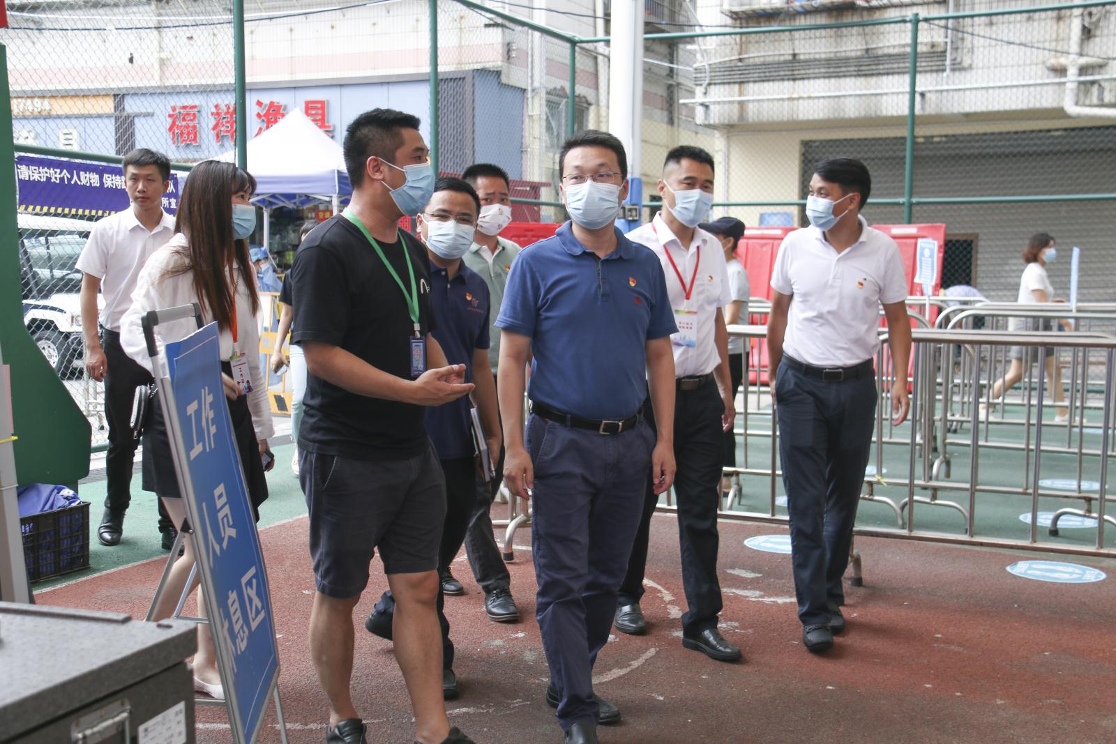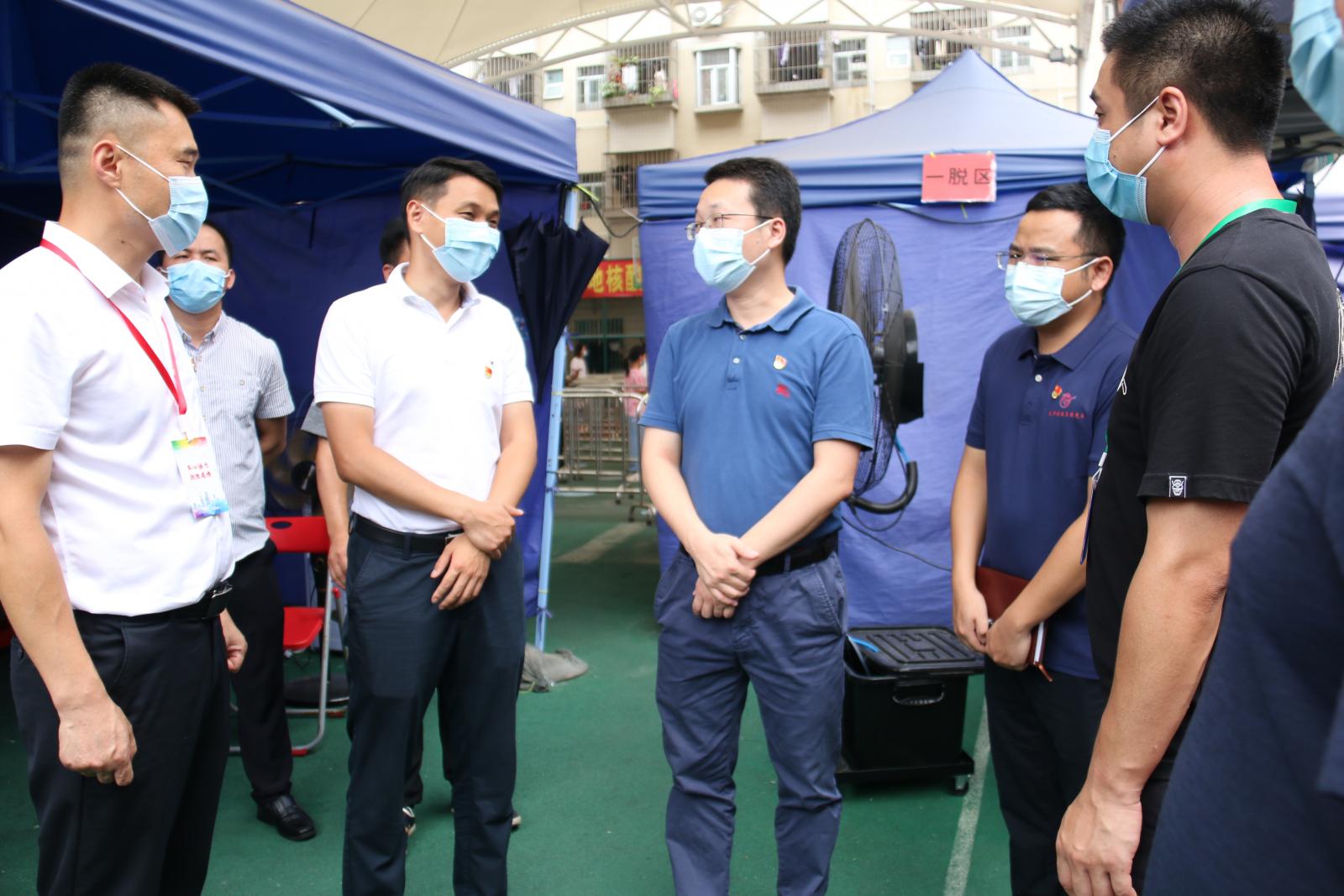 随后,张波同志一行来到民乐村篮球场“平战两用基地”,与防疫一线志愿者进行亲切交谈,详细了解了采样工作开展、人员安排、场地设施设置等内容,走访慰问奋战在疫情防控一线的社区工作人员、党员志愿者及下沉支援人员,深入了解一线的真实情况与需求。